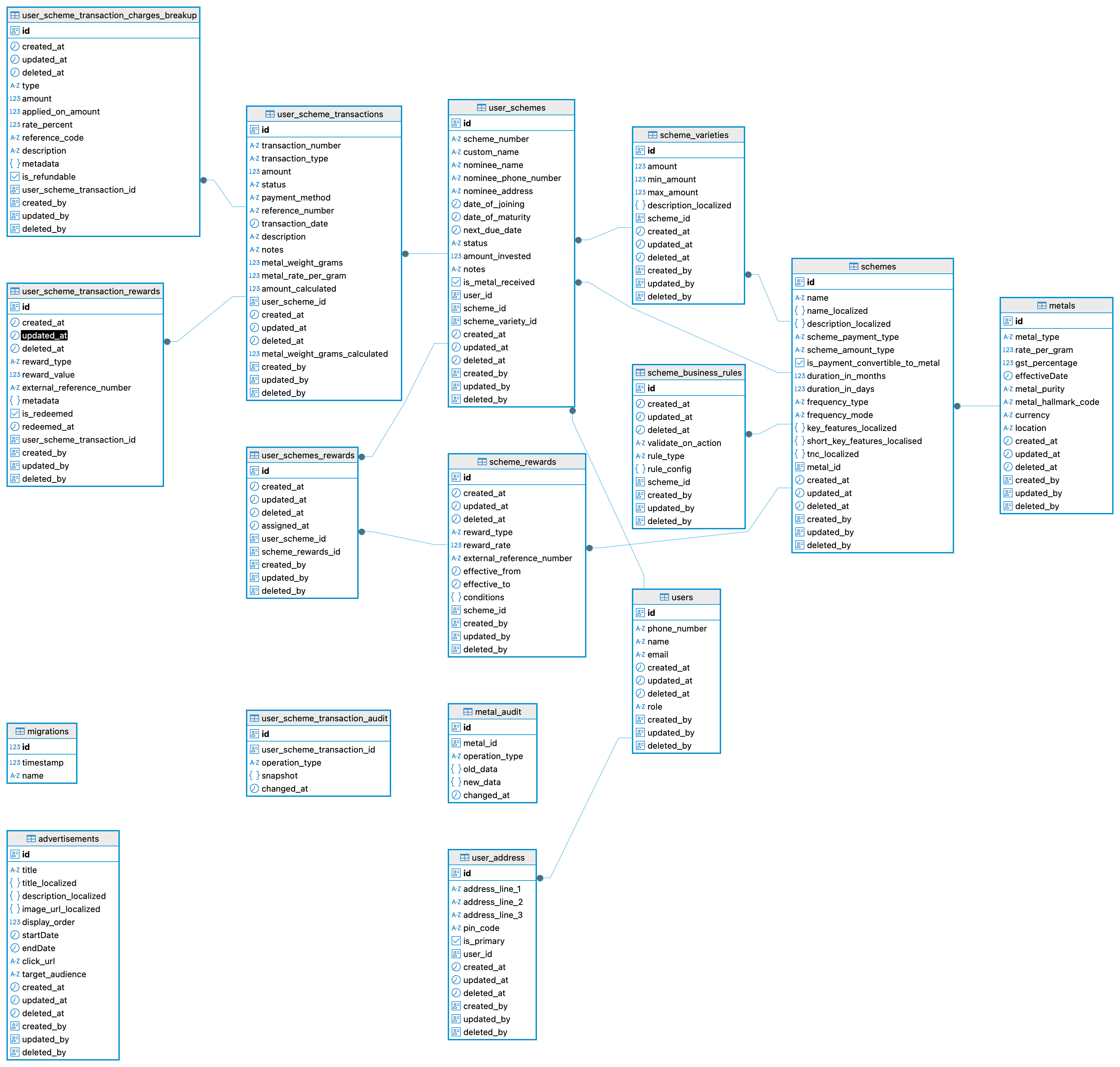• Scheme Transactions: Records all user contributions and resulting gold allocation (grams purchased at real-time price). Immutable ledger ensuring auditability and reconciliation with payments.